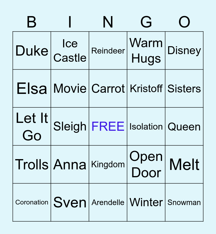 This bingo card has a free space and 25 words: Anna, Arendelle, Carrot, Coronation, Disney, Duke, Elsa, Ice Castle, Isolation, Kingdom, Kristoff, Let It Go, Open Door, Melt, Movie, Olaf, Queen, Reindeer, Sisters, Sleigh, Snowman, Sven, Trolls, Warm Hugs and Winter.
