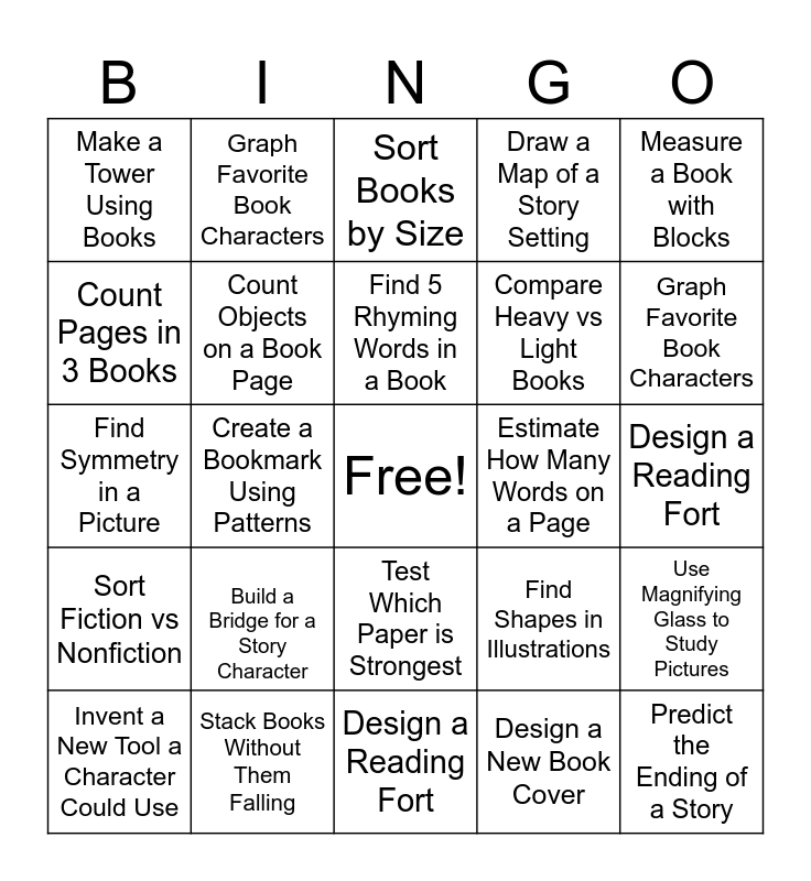 This bingo card has a free space and 24 words: Build a Bridge for a Story Character, Stack Books Without Them Falling, Find 5 Rhyming Words in a Book, Invent a New Tool a Character Could Use, Measure a Book with Blocks, Make a Tower Using Books, Count Pages in 3 Books, Graph Favorite Book Characters, Estimate How Many Words on a Page, Test Which Paper is Strongest, Compare Heavy vs Light Books, Find Symmetry in a Picture, Find Shapes in Illustrations, Use Magnifying Glass to Study Pictures, Count Objects on a Book Page, Design a New Book Cover, Design a Reading Fort, Sort Books by Size, Graph Favorite Book Characters, Create a Bookmark Using Patterns, Predict the Ending of a Story, Sort Fiction vs Nonfiction, Draw a Map of a Story Setting and Design a Reading Fort.