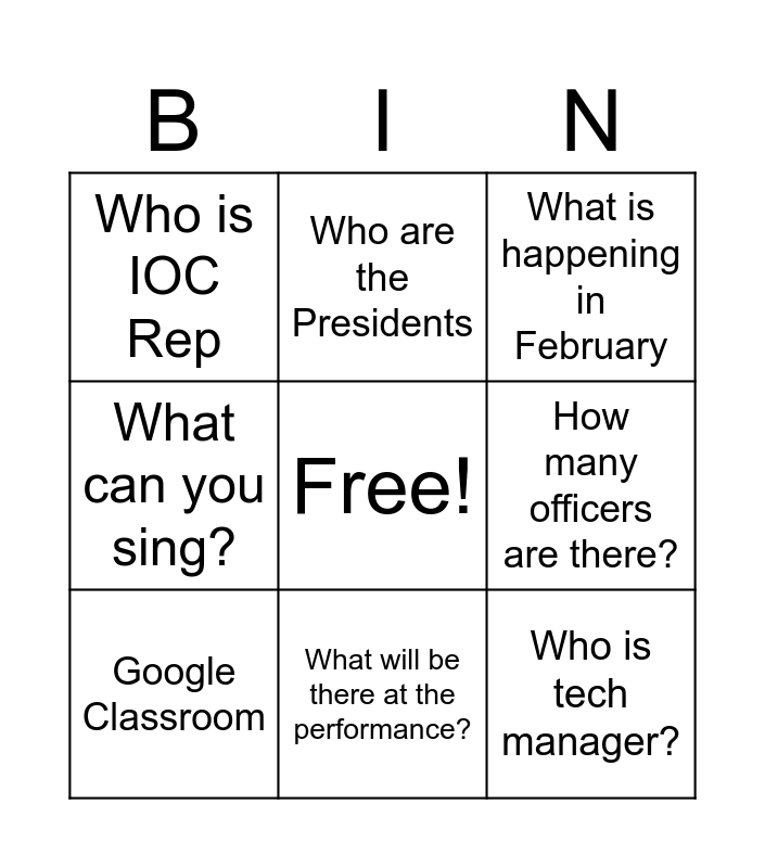 This bingo card has a free space and 24 words: What room will practices be at?, Will the practice times ever change?, What will be there at the performance?, Who is the Secretary?, Who is tech manager?, Who is IOC Rep, How many officers are there?, Who are the Presidents, Who is the Vice President?, Instagram, What will be posted on YouTube, Is Practice Mandatory or not?, List of Volunteer Opportunities, When is our next practice, Google Classroom, How much do you need to donate, Where Our Next Performance is, What is happening in February, Who is Event Coordinator?, Who is Inclusivity Rep?, Who is treasurer?, Is there a deadline for sign-ups?, What can you sing? and Can you play an instrument.