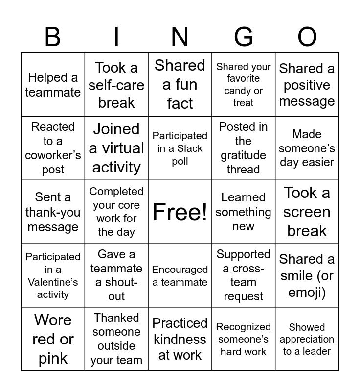 This bingo card has a free space and 24 words: Gave a teammate a shout-out, Thanked someone outside your team, Participated in a Slack poll, Wore red or pink, Shared a positive message, Helped a teammate, Reacted to a coworker’s post, Took a self-care break, Learned something new, Encouraged a teammate, Posted in the gratitude thread, Sent a thank-you message, Supported a cross-team request, Shared a smile (or emoji), Joined a virtual activity, Recognized someone’s hard work, Took a screen break, Shared a fun fact, Made someone’s day easier, Completed your core work for the day, Showed appreciation to a leader, Participated in a Valentine’s activity, Shared your favorite candy or treat and Practiced kindness at work.