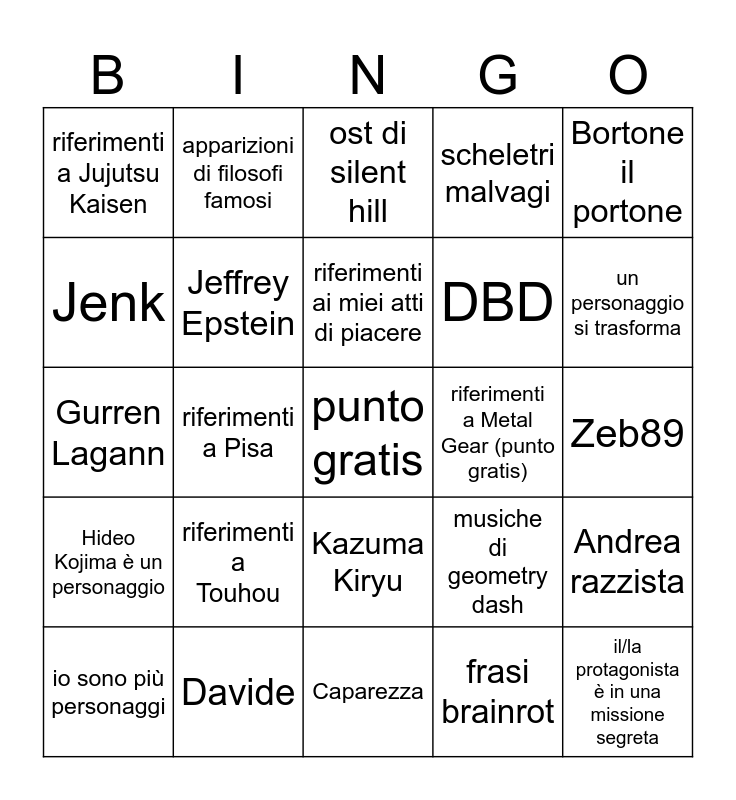 This bingo card has a free space and 24 words: riferimenti a Touhou, Davide, riferimenti ai miei atti di piacere, io sono più personaggi, Bortone il portone, riferimenti a Jujutsu Kaisen, Jenk, apparizioni di filosofi famosi, riferimenti a Metal Gear (punto gratis), Kazuma Kiryu, DBD, Gurren Lagann, musiche di geometry dash, Andrea razzista, Jeffrey Epstein, frasi brainrot, Zeb89, ost di silent hill, un personaggio si trasforma, riferimenti a Pisa, il/la protagonista è in una missione segreta, Hideo Kojima è un personaggio, scheletri malvagi and Caparezza.