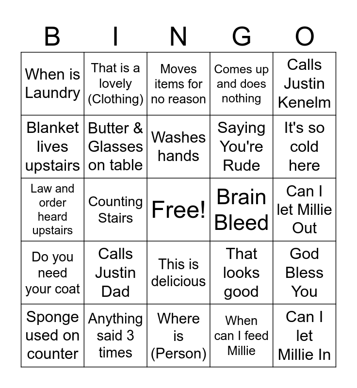 This bingo card has a free space and 30 words: Anything said 3 times, Counting Time, Counting Stairs, Please Advise, When is Laundry, Moves items for no reason, Butter & Glasses on table, This is delicious, Brain Bleed, Where is (Person), Can I let Millie Out, Can I let Millie In, When can I feed Millie, "I only eat one a day", It's so cold here, Will try to get better, That looks good, Do you need your coat, Calls Justin Dad, Calls Justin Kenelm, Law and order heard upstairs, Asks ava about Dinner, That is a lovely (Clothing), Saying You're Rude, Blanket lives upstairs, Comes up and does nothing, God Bless You, Sponge used on counter, Washes hands and Sits in chair and looks.