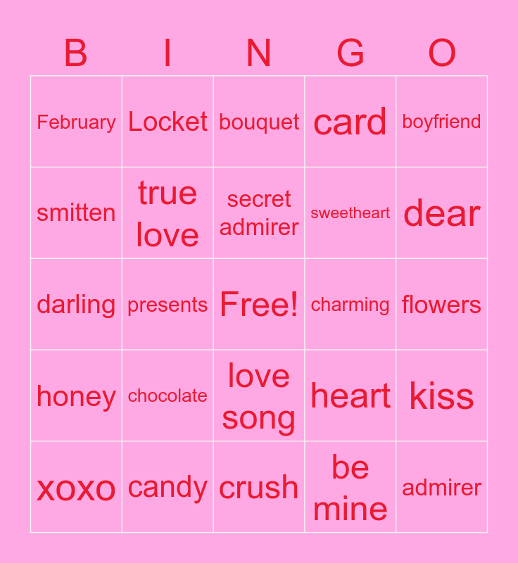 This bingo card has a free space and 45 words: 14th, admirer, affection, xoxo, beloved, be mine, bouquet, bow and arrow, boyfriend, candy, card, charming, love song, chocolate, courtship, crush, Cupid, darling, date, dear, Locket, embrace, fall in love, February, flirt, flowers, gift, girlfriend, heart, honey, hug, kiss, love, passion, poem, presents, romance, rose, Saint Valentine, secret admirer, smitten, sweetheart, tenderness, true love and woo.