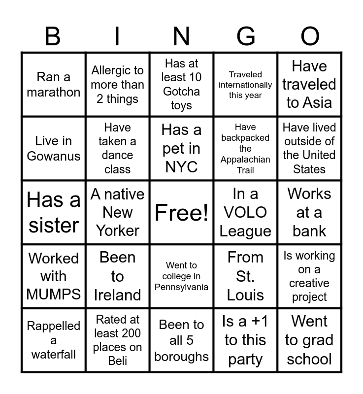 This bingo card has a free space and 29 words: Can speak 2 languages, Rated at least 200 places on Beli, Has at least 10 Gotcha toys, Works in fashion, Have traveled to Asia, Ran a marathon, Have taken a dance class, Has a pet in NYC, In a VOLO League, Is working on a creative project, Rappelled a waterfall, A native New Yorker, Is a +1 to this party, Went to grad school, Has a sister, Has walked Manhattan tip to tip, Been to all 5 boroughs, From St. Louis, Have lived outside of the United States, Worked with MUMPS, Been to Ireland, Can eat an apple in one bite, Have backpacked the Appalachian Trail, Works at a bank, Live in Gowanus, Allergic to more than 2 things, Went to college in Pennsylvania, Traveled internationally this year and Has helped friends move in NYC.