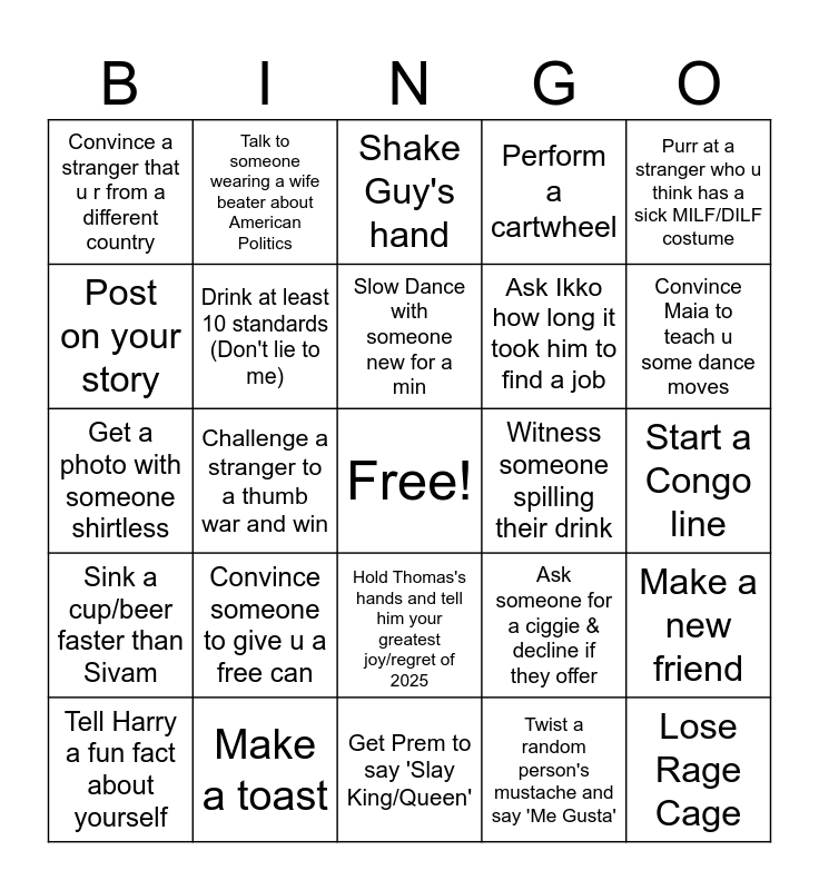 This bingo card has a free space and 24 words: Convince someone to give u a free can, Make a toast, Slow Dance with someone new for a min, Tell Harry a fun fact about yourself, Purr at a stranger who u think has a sick MILF/DILF costume, Convince a stranger that u r from a different country, Post on your story, Talk to someone wearing a wife beater about American Politics, Witness someone spilling their drink, Hold Thomas's hands and tell him your greatest joy/regret of 2025, Ask Ikko how long it took him to find a job, Get a photo with someone shirtless, Ask someone for a ciggie & decline if they offer, Make a new friend, Drink at least 10 standards (Don't lie to me), Twist a random person's mustache and say 'Me Gusta', Start a Congo line, Shake Guy's hand, Convince Maia to teach u some dance moves, Challenge a stranger to a thumb war and win, Lose Rage Cage, Sink a cup/beer faster than Sivam, Perform a cartwheel and Get Prem to say 'Slay King/Queen'.