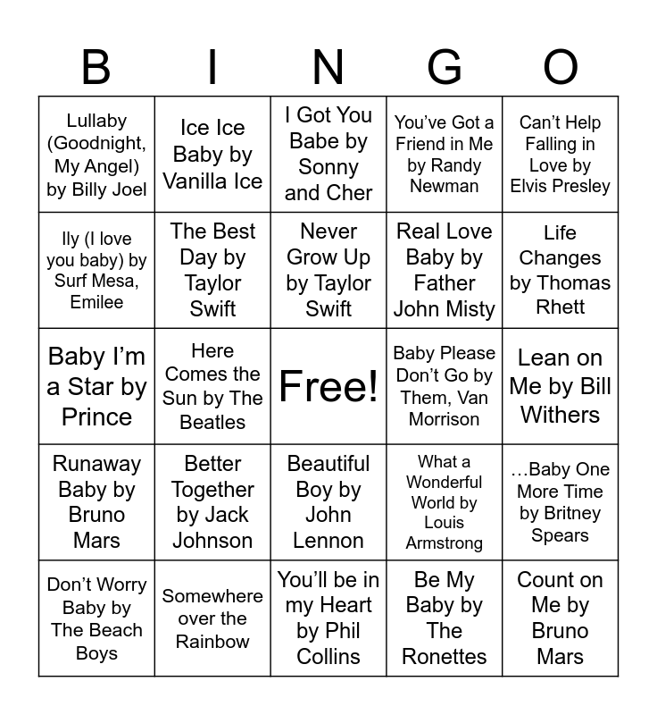 This bingo card has a free space and 28 words: …Baby One More Time by Britney Spears, Baby by Justin Bieber, Real Love Baby by Father John Misty, Be My Baby by The Ronettes, Ily (I love you baby) by Surf Mesa, Emilee, I Got You Babe by Sonny and Cher, Ice Ice Baby by Vanilla Ice, Runaway Baby by Bruno Mars, Baby Please Don’t Go by Them, Van Morrison, Don’t Worry Baby by The Beach Boys, Baby I’m a Star by Prince, You’ve Got a Friend in Me by Randy Newman, Somewhere over the Rainbow, You’ll be in my Heart by Phil Collins, Life Changes by Thomas Rhett, Haven’t Met You Yet by Michael Buble, Better Together by Jack Johnson, The Best Day by Taylor Swift, Never Grow Up by Taylor Swift, Beautiful Boy by John Lennon, Lullaby (Goodnight, My Angel) by Billy Joel, Mama’s Song by Carrie Underwood, Count on Me by Bruno Mars, Here Comes the Sun by The Beatles, Lean on Me by Bill Withers, What a Wonderful World by Louis Armstrong, Can’t Help Falling in Love by Elvis Presley and A Thousand Miles by Vanessa Carlton.