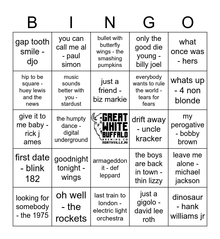 This bingo card has a free space and 55 words: whats it to you - clay walker, looking for somebody - the 1975, we just disagree - billy dean, gap tooth smile - djo, last train to london - electric light orchestra, terrapin - clairo, music sounds better with you - stardust, adore you - harry styles, everybody wants to rule the world - tears for fears, i wanna dance with somebody - whitney houston, only the good die young - billy joel, come on eileen - dexys midnight runner, kool aid - royel otis, 12 to 12 - sombr, ride like the wind - christopher cross, so easy - olivia dean, what once was - hers, the humpty dance - digital underground, bust a move - young mc, dinosaur - hank williams jr, drift away - uncle kracker, mess around - ray charles, the boys are back in town - thin lizzy, bullet with butterfly wings - the smashing pumpkins, welcome to paradise - green day, just a friend - biz markie, just a gigolo - david lee roth, boot scootin boogie - brooks and dunn, my perogative - bobby brown, leave me alone - michael jackson, i stay away - alice in chains, give it up - kc and the sunshine band, the edge of heaven - wham, play that funky music - wild cherry, hip to be square - huey lewis and the news, give it to me baby - rick james, best friend - 50 cent, first date - blink 182, its all coming back to me now - celine dion, gimme gimme gimme - abba, you can call me al - paul simon, my girl - the temptations, my eyes dont cry - stevie wonder, crocodile rock - elton john, goodnight tonight - wings, oh well - the rockets, oklahoma smokeshow - zach bryan, heaven knows im miserable now - the smiths, me myself and i - de la soul, whats up - 4 non blonde, get down - still woozy, good people - jack johnson, smooth - santana, armageddon it - def leppard and dont get me wrong - the pretenders.