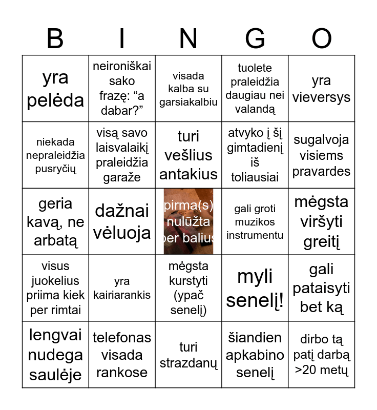 This bingo card has 1 images and 25 words: yra kairiarankis, turi strazdanų, turi vešlius antakius, lengvai nudega saulėje, yra vieversys, yra pelėda, niekada nepraleidžia pusryčių, neironiškai sako frazę: “a dabar?”, gali groti muzikos instrumentu, mėgsta kurstyti (ypač senelį), atvyko į šį gimtadienį iš toliausiai, geria kavą, ne arbatą, myli senelį!, gali pataisyti bet ką, visą savo laisvalaikį praleidžia garaže, dirbo tą patį darbą >20 metų, mėgsta viršyti greitį, visada kalba su garsiakalbiu, sugalvoja visiems pravardes, dažnai vėluoja, pirma(s) nulūžta per balius, telefonas visada rankose, visus juokelius priima kiek per rimtai, tuolete praleidžia daugiau nei valandą and šiandien apkabino senelį.