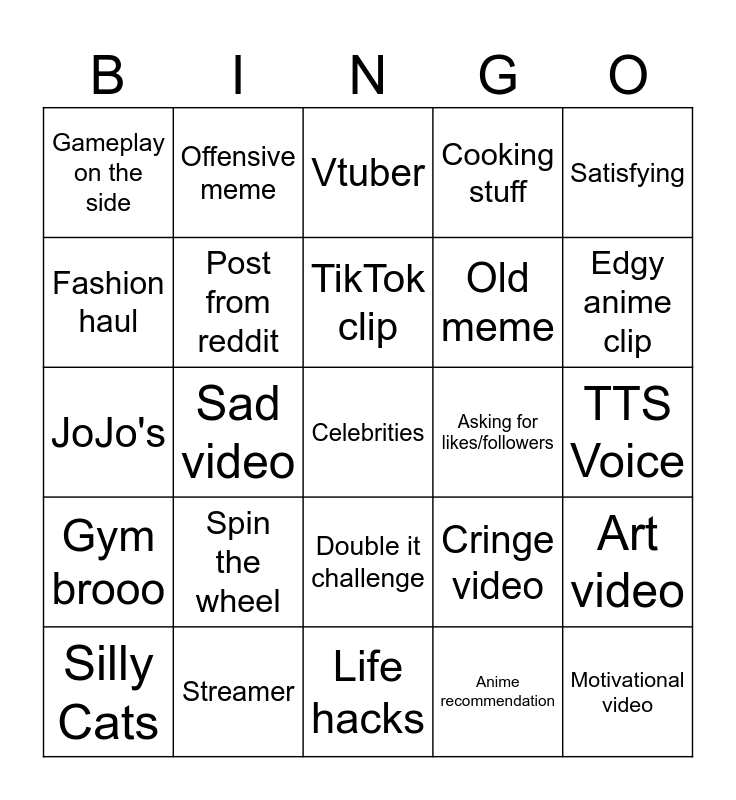 This bingo card has a free space and 24 words: Spin the wheel, Streamer, TikTok clip, Silly Cats, Satisfying, Gameplay on the side, Fashion haul, Offensive meme, Asking for likes/followers, Double it challenge, Old meme, JoJo's, Cringe video, Art video, Post from reddit, Anime recommendation, TTS Voice, Vtuber, Edgy anime clip, Sad video, Motivational video, Gym brooo, Cooking stuff and Life hacks.