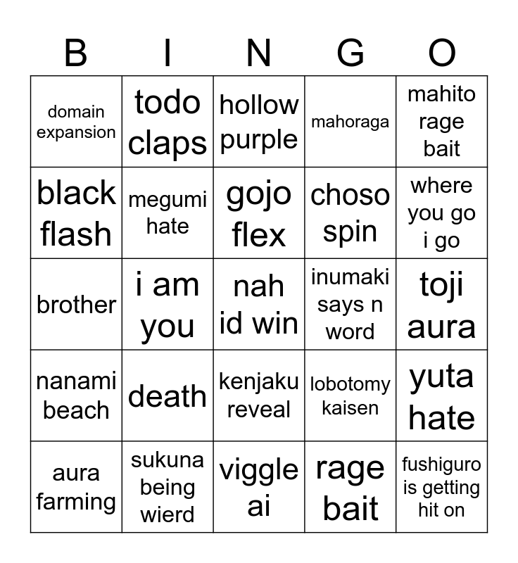 This bingo card has a free space and 24 words: death, sukuna being wierd, gojo flex, aura farming, mahito rage bait, domain expansion, black flash, todo claps, inumaki says n word, kenjaku reveal, choso spin, brother, lobotomy kaisen, yuta hate, megumi hate, rage bait, toji aura, hollow purple, where you go i go, i am you, fushiguro is getting hit on, nanami beach, mahoraga and viggle ai.