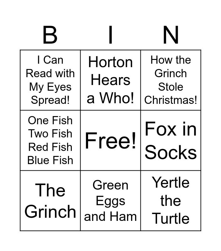 This bingo card has a free space and 11 words: The Cat in the Hat, Green Eggs and Ham, Yertle the Turtle, The Grinch, Horton Hears a Who!, How the Grinch Stole Christmas!, Fox in Socks, Hop on Pop, One Fish Two Fish Red Fish Blue Fish, I Can Read with My Eyes Spread! and The Cat in the Hat Songbook.