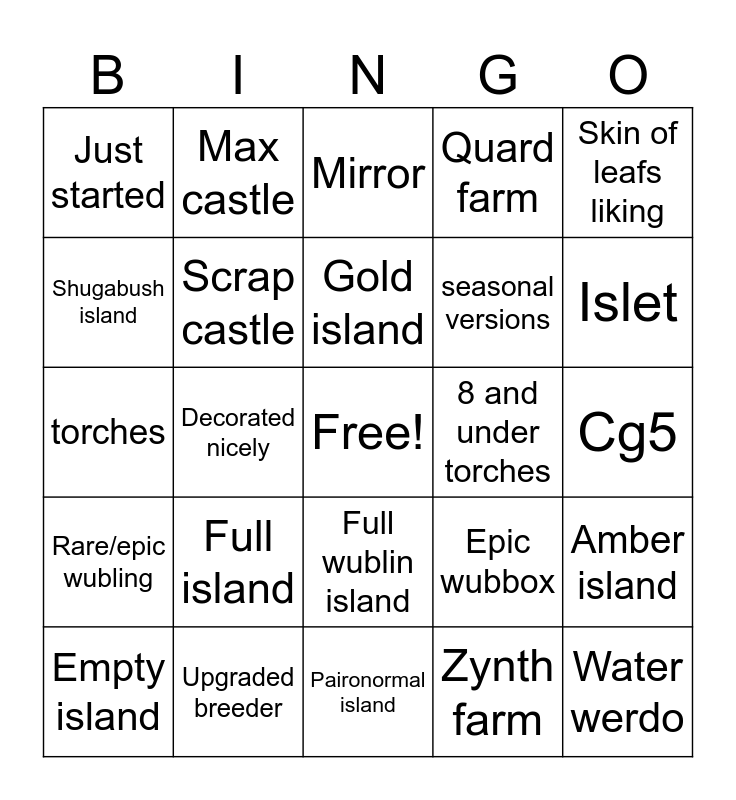 This bingo card has a free space and 24 words: Full island, Upgraded breeder, Gold island, Empty island, Skin of leafs liking, Just started, Shugabush island, Max castle, 8 and under torches, Full wublin island, seasonal versions, torches, Epic wubbox, Amber island, Scrap castle, Zynth farm, Cg5, Mirror, Islet, Decorated nicely, Water werdo, Rare/epic wubling, Quard farm and Paironormal island.
