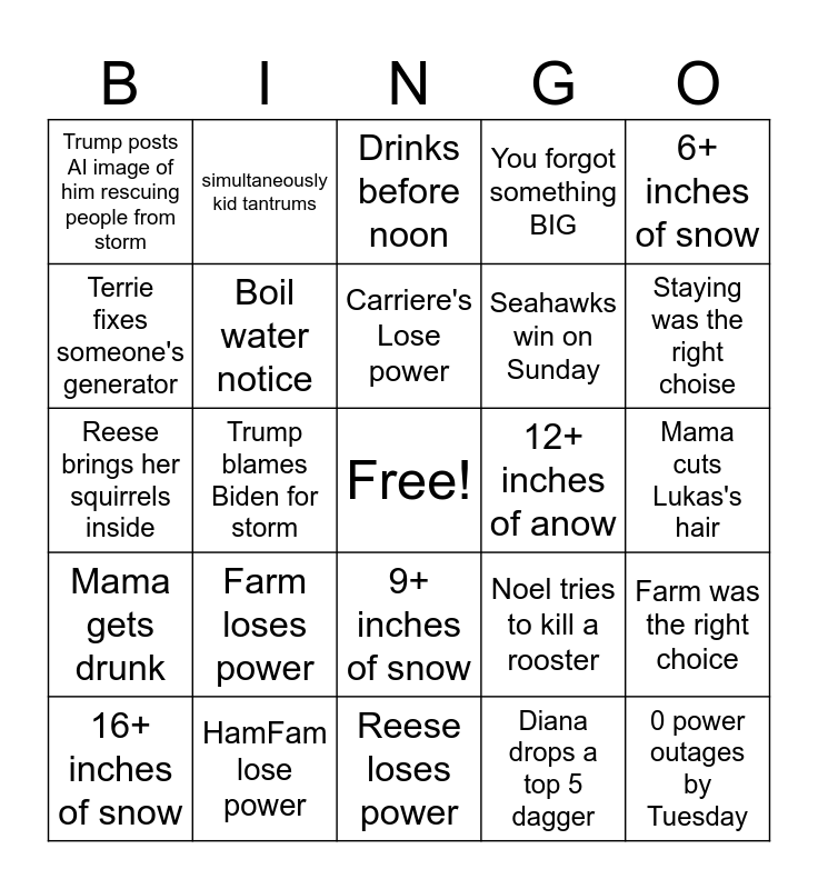 This bingo card has a free space and 24 words: Farm loses power, HamFam lose power, Carriere's Lose power, 16+ inches of snow, 6+ inches of snow, Trump posts AI image of him rescuing people from storm, Terrie fixes someone's generator, simultaneously kid tantrums, 12+ inches of anow, 9+ inches of snow, Seahawks win on Sunday, Reese brings her squirrels inside, Noel tries to kill a rooster, Farm was the right choice, Boil water notice, Diana drops a top 5 dagger, Mama cuts Lukas's hair, Drinks before noon, Staying was the right choise, Trump blames Biden for storm, 0 power outages by Tuesday, Mama gets drunk, You forgot something BIG and Reese loses power.