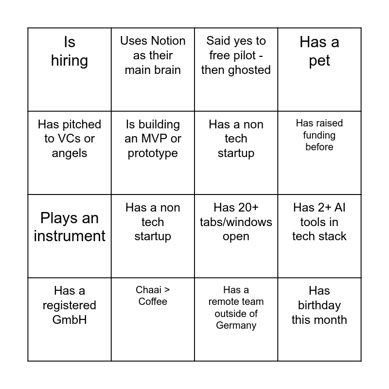 This bingo card has 16 words: Chaai > Coffee, Has 2+ AI tools in tech stack, Said yes to free pilot - then ghosted, Is hiring, Plays an instrument, Uses Notion as their main brain, Has 20+ tabs/windows open, Has a remote team outside of Germany, Has pitched to VCs or angels, Is building an MVP or prototype, Has a registered GmbH, Has a pet, Has a non tech startup, Has raised funding before, Has a non tech startup and Has birthday this month.
