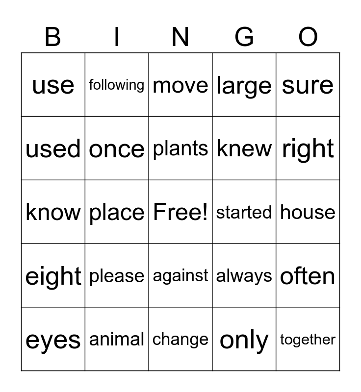 This bingo card has a free space and 24 words: please, animal, plants, eyes, sure, use, used, following, started, against, knew, know, always, often, once, only, house, move, right, place, together, eight, large and change.
