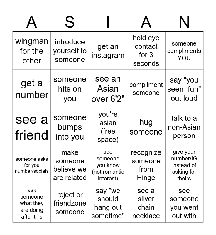 This bingo card has a free space and 24 words: make someone believe we are related, reject or friendzone someone, see an Asian over 6'2", ask someone what they are doing after this, someone compliments YOU, wingman for the other, get a number, introduce yourself to someone, hug someone, see someone you know (not romantic interest), compliment someone, see a friend, recognize someone from Hinge, give your number/IG instead of asking for theirs, someone hits on you, see a silver chain necklace, talk to a non-Asian person, get an instagram, say "you seem fun" out loud, someone bumps into you, see someone you went out with, someone asks for you number/socials, hold eye contact for 3 seconds and say "we should hang out sometime".