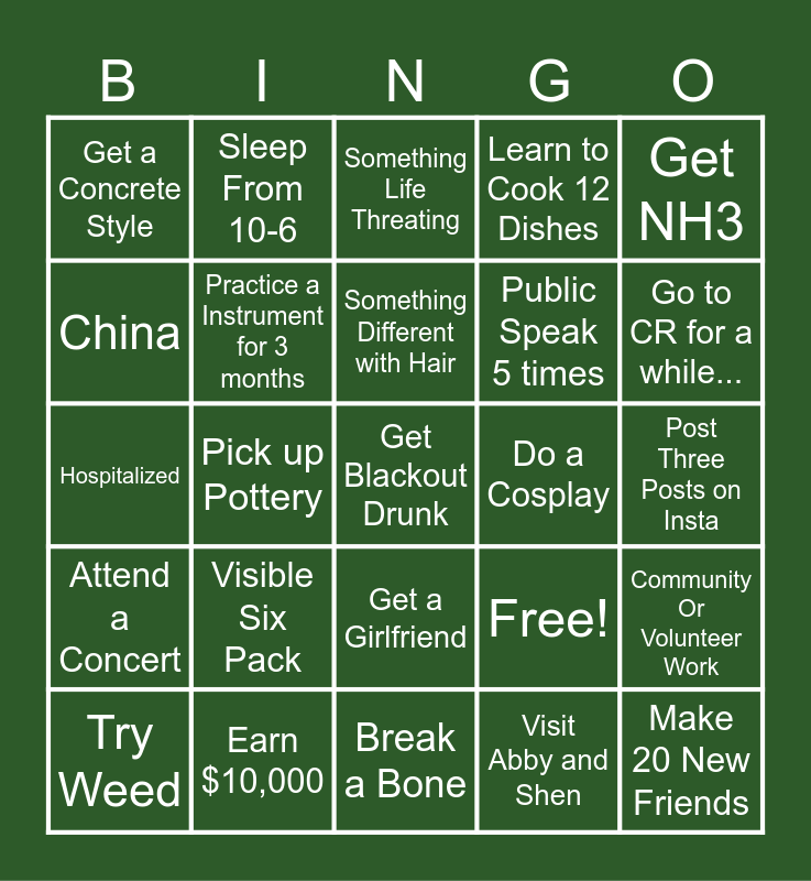 This bingo card has 25 words: Visible Six Pack, Break a Bone, Something Different with Hair, Try Weed, Get NH3, Get a Concrete Style, China, Sleep From 10-6, Do a Cosplay, Get a Girlfriend, Public Speak 5 times, Hospitalized, Free!, Community Or Volunteer Work, Practice a Instrument for 3 months, Make 20 New Friends, Post Three Posts on Insta, Something Life Threating, Go to CR for a while..., Pick up Pottery, Get Blackout Drunk, Earn $10,000, Attend a Concert, Learn to Cook 12 Dishes and Visit Abby and Shen.
