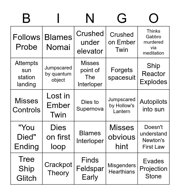 This bingo card has a free space and 24 words: Dies on first loop, Crackpot Theory, Misses point of The Interloper, Tree Ship Glitch, Thinks Gabbro murdered via meditation, Follows Probe, Attempts sun station landing, Blames Nomai, Jumpscared by Hollow's Lantern, Blames Interloper, Forgets spacesuit, Misses Controls, Misses obvious hint, Doesn't understand Newton's First Law, Jumpscared by quantum object, Misgenders Hearthians, Autopilots into sun, Crushed under elevator, Ship Reactor Explodes, Lost in Ember Twin, Evades Projection Stone, "You Died" Ending, Crushed on Ember Twin and Finds Feldspar Early.