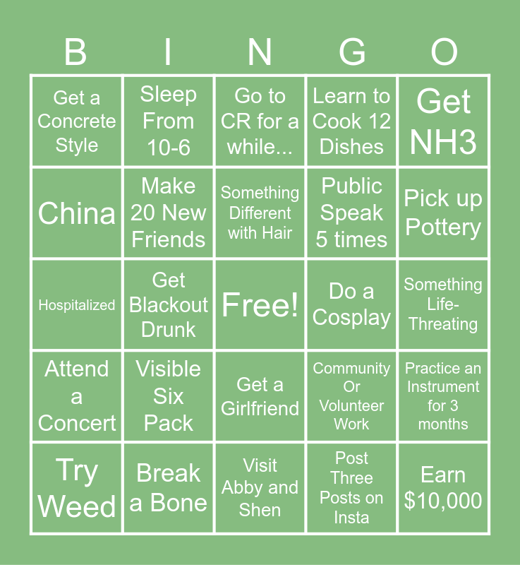 This bingo card has a free space and 24 words: Visible Six Pack, Break a Bone, Something Different with Hair, Try Weed, Get NH3, Get a Concrete Style, China, Sleep From 10-6, Do a Cosplay, Get a Girlfriend, Public Speak 5 times, Hospitalized, Community Or Volunteer Work, Practice an Instrument for 3 months, Make 20 New Friends, Post Three Posts on Insta, Something Life-Threating, Go to CR for a while..., Pick up Pottery, Get Blackout Drunk, Earn $10,000, Attend a Concert, Learn to Cook 12 Dishes and Visit Abby and Shen.