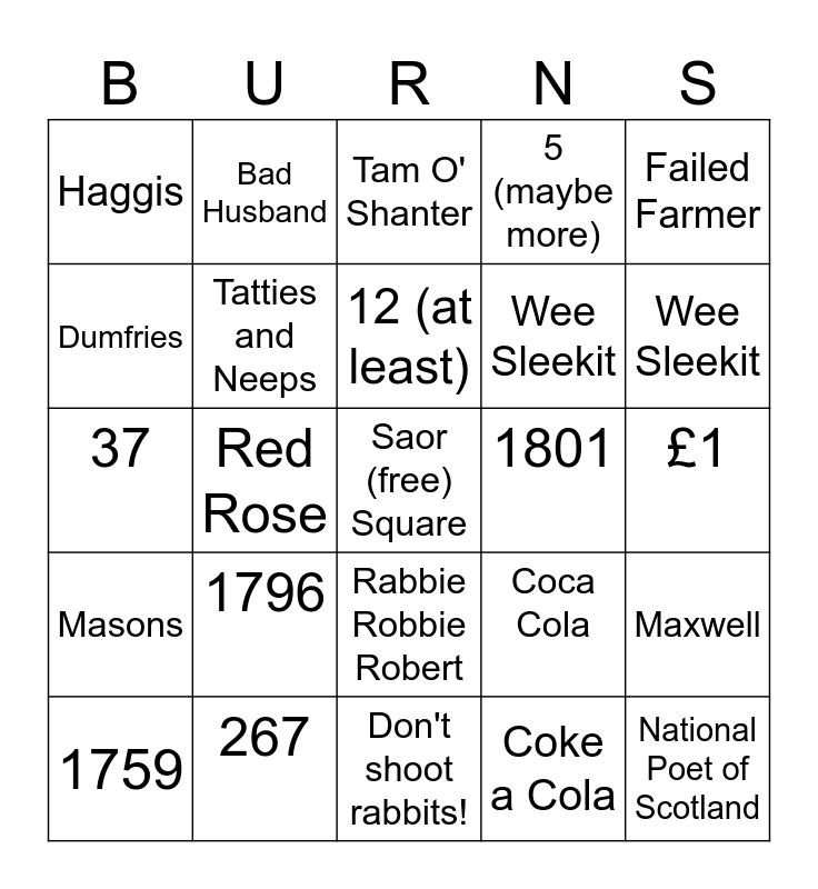 This bingo card has a free space and 29 words: 1759, Jean Armour, Red Rose, Everyone is Scottish on New Year's Eve, Haggis, Tam O' Shanter, Tatties and Neeps, 1796, 1801, 267, £1, National Poet of Scotland, Don't shoot rabbits!, Coke a Cola, Wee Sleekit, Burns Burnes, Rabbie Robbie Robert, Masons, Failed Farmer, 37, Coca Cola, Failed Farmer, Wee Sleekit, Dumfries, 5 (maybe more), Bad Husband, Maxwell, 12 (at least) and Alloway.