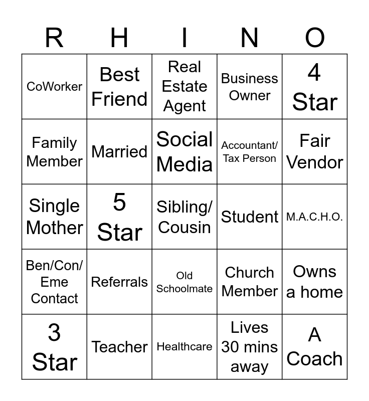 This bingo card has a free space and 24 words: Referrals, Teacher, Social Media, 3 Star, 4 Star, CoWorker, Family Member, Best Friend, Student, Old Schoolmate, Accountant/ Tax Person, Single Mother, Church Member, Owns a home, Married, Lives 30 mins away, M.A.C.H.O., Real Estate Agent, Fair Vendor, 5 Star, A Coach, Ben/Con/ Eme Contact, Business Owner and Healthcare.
