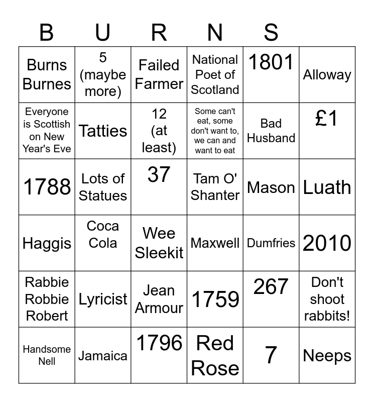 This bingo card has 36 words: 1759, Jean Armour, Red Rose, Everyone is Scottish on New Year's Eve, Haggis, Tam O' Shanter, Tatties, 1796, 1801, 267, £1, National Poet of Scotland, Don't shoot rabbits!, Lots of Statues, Some can't eat, some don't want to, we can and want to eat, Burns Burnes, Rabbie Robbie Robert, Mason, 1788, Failed Farmer, 37, Coca Cola, Maxwell, Wee Sleekit, Dumfries, 5 (maybe more), Bad Husband, Jamaica, 12 (at least), Alloway, Neeps, Handsome Nell, 2010, Luath, Lyricist and 7.
