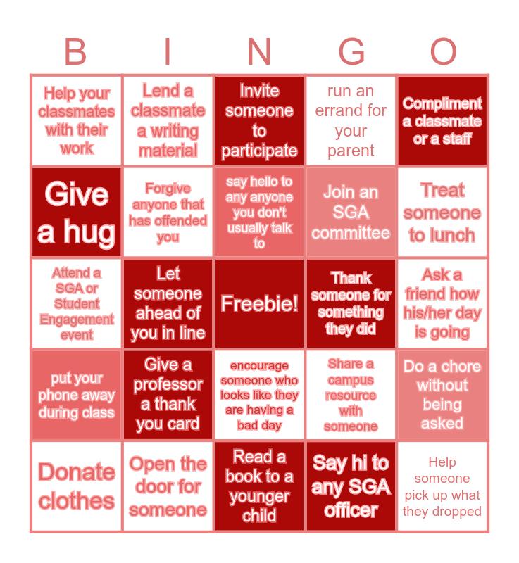 This bingo card has a free space and 24 words: Give a professor a thank you card, Open the door for someone, say hello to any anyone you don't usually talk to, Donate clothes, Compliment a classmate or a staff, Help your classmates with their work, Give a hug, Lend a classmate a writing material, Thank someone for something they did, encourage someone who looks like they are having a bad day, Join an SGA committee, Attend a SGA or Student Engagement event, Share a campus resource with someone, Do a chore without being asked, Forgive anyone that has offended you, Say hi to any SGA officer, Ask a friend how his/her day is going, Invite someone to participate, Treat someone to lunch, Let someone ahead of you in line, Help someone pick up what they dropped, put your phone away during class, run an errand for your parent and Read a book to a younger child.