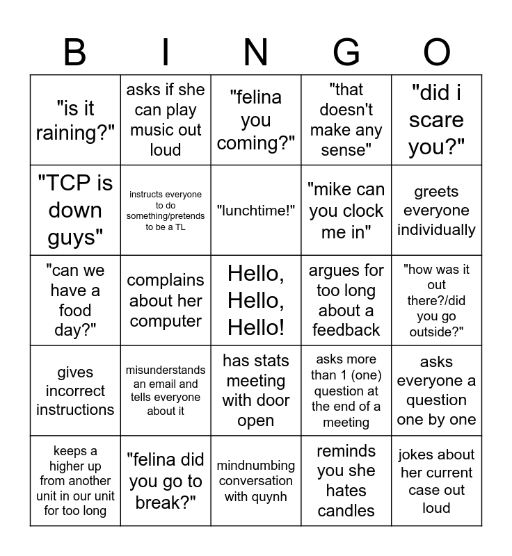 This bingo card has a free space and 33 words: talks about the temperature in the unit, talks about the weather, complains about her computer, talks to felina for over 10 minutes, gives incorrect instructions, instructs everyone to do something/pretends to be a TL, "did i scare you?", keeps a higher up from another unit in our unit for too long, asks if she can play music out loud, "break break break!", "lunchtime!", "felina you coming?", makes a joke to complete silence, responds to a teams message out loud, argues for too long about a feedback, greets everyone individually, "felina did you go to break?", "can we have a food day?", misunderstands an email and tells everyone about it, asks more than 1 (one) question at the end of a meeting, has stats meeting with door open, tells questionable story about family, "is it raining?", "how was it out there?/did you go outside?", mindnumbing conversation with quynh, jokes about her current case out loud, "that doesn't make any sense", "mike can you clock me in", "TCP is down guys", asks everyone a question one by one, reading a book while walking in the hallway, reminds you she hates candles and pronounces "steward" as "stuart".
