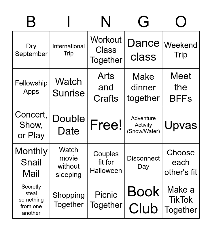 This bingo card has a free space and 24 words: Watch movie without sleeping, Shopping Together, Arts and Crafts, Secretly steal something from one another, Weekend Trip, Dry September, Fellowship Apps, International Trip, Adventure Activity (Snow/Water), Couples fit for Halloween, Make dinner together, Concert, Show, or Play, Disconnect Day, Choose each other's fit, Watch Sunrise, Book Club, Upvas, Workout Class Together, Meet the BFFs, Double Date, Make a TikTok Together, Monthly Snail Mail, Dance class and Picnic Together.