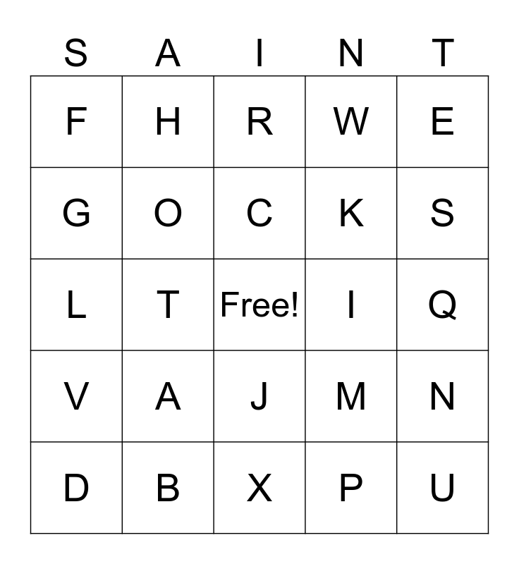 This bingo card has a free space and 24 words: A, B, C, D, E, F, G, H, I, J, K, L, M, N, O, P, Q, R, S, T, U, V, W and X.