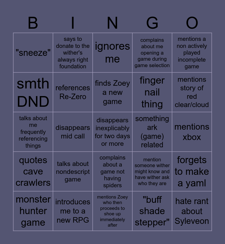 This bingo card has a free space and 24 words: talks about nondescript game, introduces me to a new RPG, finds Zoey a new game, monster hunter game, mentions a non actively played incomplete game, "sneeze", smth DND, says to donate to the wither's always right foundation, something ark (game) related, complains about a game not having spiders, finger nail thing, talks about me frequently referencing things, mention someone wither might know and have wither ask who they are, forgets to make a yaml, references Re-Zero, "buff shade stepper", mentions xbox, ignores me, mentions story of red clear/cloud, disappears mid call, hate rant about Syleveon, quotes cave crawlers, complains about me opening a game during game selection and mentions Zoey who then proceeds to shoe up immediately after.