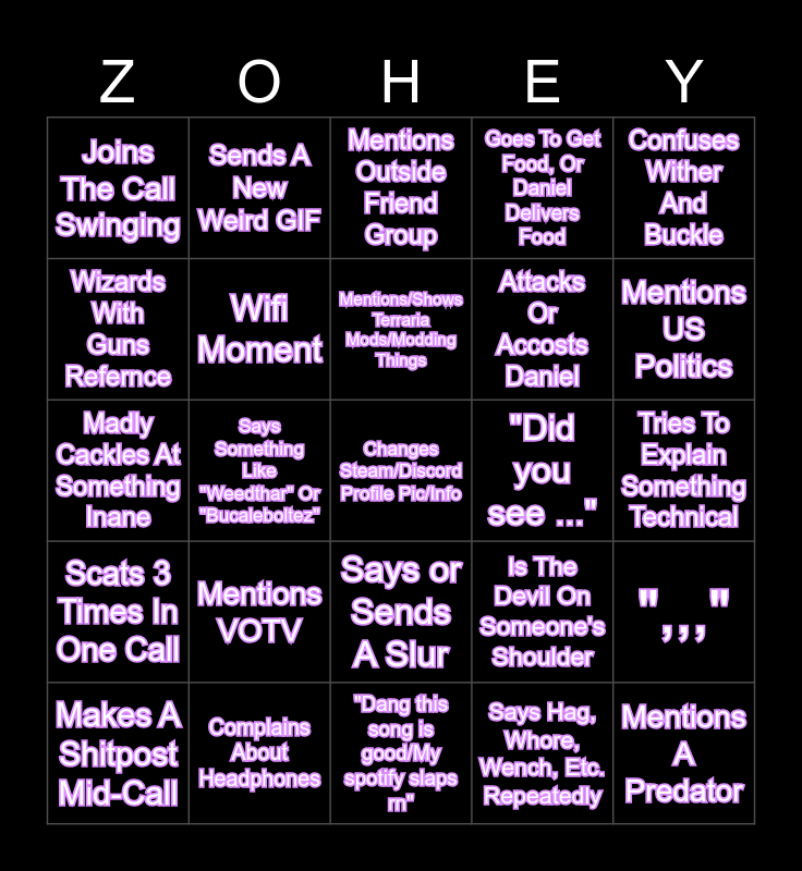 This bingo card has a free space and 24 words: Mentions VOTV, Complains About Headphones, Mentions/Shows Terraria Mods/Modding Things, Makes A Shitpost Mid-Call, Confuses Wither And Buckle, Joins The Call Swinging, Wizards With Guns Refernce, Sends A New Weird GIF, "Did you see ...", Says or Sends A Slur, Attacks Or Accosts Daniel, Madly Cackles At Something Inane, Is The Devil On Someone's Shoulder, ",,,", Wifi Moment, Says Hag, Whore, Wench, Etc. Repeatedly, Tries To Explain Something Technical, Mentions Outside Friend Group, Mentions US Politics, Says Something Like "Weedthar" Or "Bucaleboltez", Mentions A Predator, Scats 3 Times In One Call, Goes To Get Food, Or Daniel Delivers Food and "Dang this song is good/My spotify slaps rn".