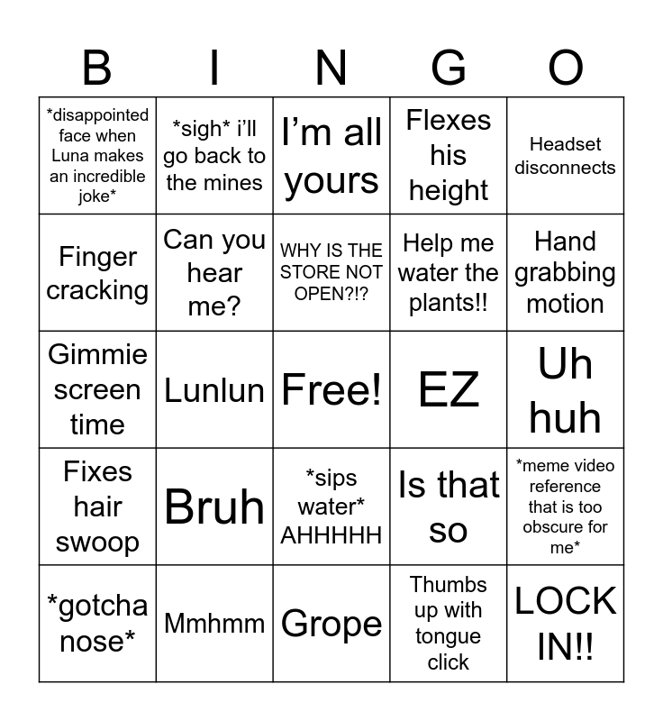 This bingo card has a free space and 24 words: Bruh, Mmhmm, WHY IS THE STORE NOT OPEN?!?, *gotcha nose*, Headset disconnects, *disappointed face when Luna makes an incredible joke*, Finger cracking, *sigh* i’ll go back to the mines, EZ, *sips water* AHHHHH, Help me water the plants!!, Gimmie screen time, Is that so, *meme video reference that is too obscure for me*, Can you hear me?, Thumbs up with tongue click, Uh huh, I’m all yours, Hand grabbing motion, Lunlun, LOCK IN!!, Fixes hair swoop, Flexes his height and Grope.