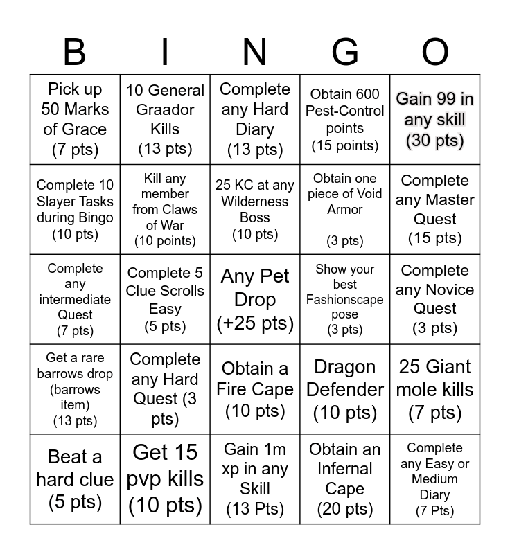 This bingo card has a free space and 24 words: Complete any Hard Quest (3 pts), Get 15 pvp kills (10 pts), 25 KC at any Wilderness Boss (10 pts), Beat a hard clue (5 pts), Gain 99 in any skill (30 pts), Pick up 50 Marks of Grace (7 pts), Complete 10 Slayer Tasks during Bingo (10 pts), 10 General Graador Kills (13 pts), Show your best Fashionscape pose (3 pts), Obtain a Fire Cape (10 pts), Obtain one piece of Void Armor (3 pts), Complete any intermediate Quest (7 pts), Dragon Defender (10 pts), 25 Giant mole kills (7 pts), Kill any member from Claws of War (10 points), Obtain an Infernal Cape (20 pts), Complete any Novice Quest (3 pts), Complete any Hard Diary (13 pts), Complete any Master Quest (15 pts), Complete 5 Clue Scrolls Easy (5 pts), Complete any Easy or Medium Diary (7 Pts), Get a rare barrows drop (barrows item) (13 pts), Obtain 600 Pest-Control points (15 points) and Gain 1m xp in any Skill (13 Pts).