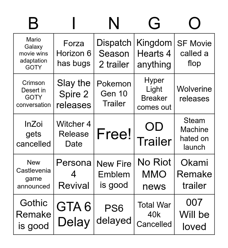 This bingo card has a free space and 24 words: Persona 4 Revival, GTA 6 Delay, Pokemon Gen 10 Trailer, Gothic Remake is good, SF Movie called a flop, Mario Galaxy movie wins adaptation GOTY, Crimson Desert in GOTY conversation, Forza Horizon 6 has bugs, OD Trailer, New Fire Emblem is good, Hyper Light Breaker comes out, InZoi gets cancelled, No Riot MMO news, Okami Remake trailer, Slay the Spire 2 releases, Total War 40k Cancelled, Steam Machine hated on launch, Dispatch Season 2 trailer, Wolverine releases, Witcher 4 Release Date, 007 Will be loved, New Castlevenia game announced, Kingdom Hearts 4 anything and PS6 delayed.