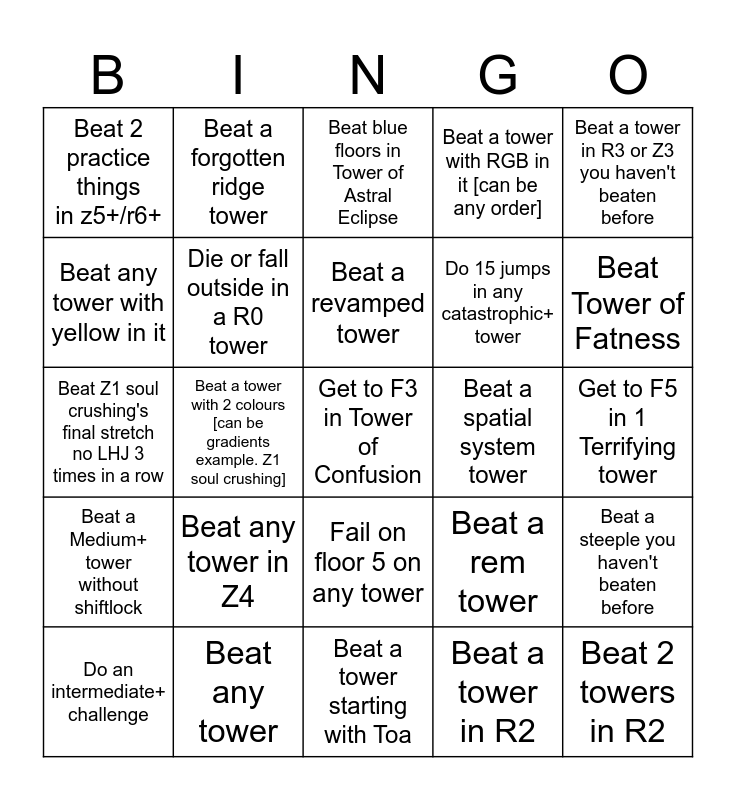 This bingo card has 25 words: Beat any tower in Z4, Beat a tower starting with Toa, Beat a revamped tower, Do an intermediate+ challenge, Beat a tower in R3 or Z3 you haven't beaten before, Beat 2 practice things in z5+/r6+, Beat any tower with yellow in it, Beat a forgotten ridge tower, Beat a spatial system tower, Fail on floor 5 on any tower, Do 15 jumps in any catastrophic+ tower, Beat Z1 soul crushing's final stretch no LHJ 3 times in a row, Beat a rem tower, Beat a steeple you haven't beaten before, Die or fall outside in a R0 tower, Beat 2 towers in R2, Get to F5 in 1 Terrifying tower, Beat blue floors in Tower of Astral Eclipse, Beat Tower of Fatness, Beat a tower with 2 colours [can be gradients example. Z1 soul crushing], Get to F3 in Tower of Confusion, Beat any tower, Beat a Medium+ tower without shiftlock, Beat a tower with RGB in it [can be any order] and Beat a tower in R2.