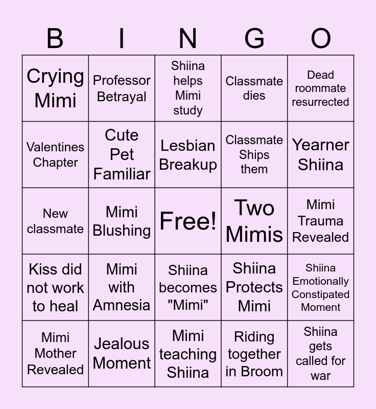 This bingo card has a free space and 24 words: Mimi with Amnesia, Jealous Moment, Lesbian Breakup, Mimi Mother Revealed, Dead roommate resurrected, Crying Mimi, Valentines Chapter, Professor Betrayal, Two Mimis, Shiina becomes "Mimi", Classmate Ships them, New classmate, Shiina Protects Mimi, Shiina Emotionally Constipated Moment, Cute Pet Familiar, Riding together in Broom, Mimi Trauma Revealed, Shiina helps Mimi study, Yearner Shiina, Mimi Blushing, Shiina gets called for war, Kiss did not work to heal, Classmate dies and Mimi teaching Shiina.