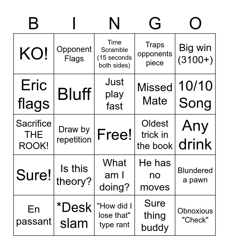 This bingo card has a free space and 24 words: Is this theory?, *Desk slam, Just play fast, En passant, Big win (3100+), KO!, Eric flags, Opponent Flags, Oldest trick in the book, What am I doing?, Missed Mate, Sacrifice THE ROOK!, He has no moves, Blundered a pawn, Bluff, Sure thing buddy, Any drink, Time Scramble (15 seconds both sides), 10/10 Song, Draw by repetition, Obnoxious "Check", Sure!, Traps opponents piece and "How did I lose that" type rant.
