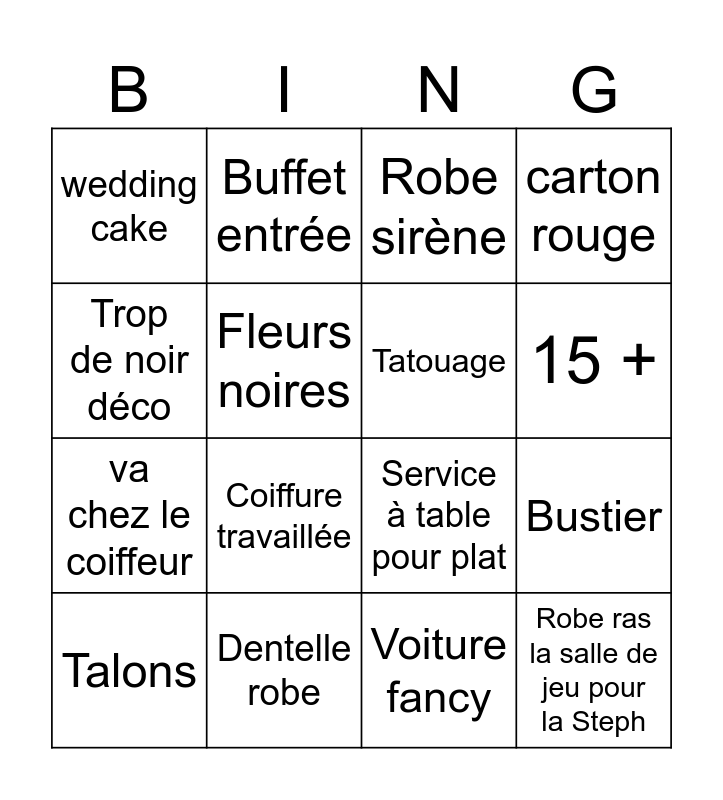 This bingo card has 16 words: Dentelle robe, Bustier, Robe sirène, wedding cake, va chez le coiffeur, Buffet entrée, Service à table pour plat, Voiture fancy, Trop de noir déco, Fleurs noires, Talons, carton rouge, Coiffure travaillée, 15 +, Tatouage and Robe ras la salle de jeu pour la Steph.