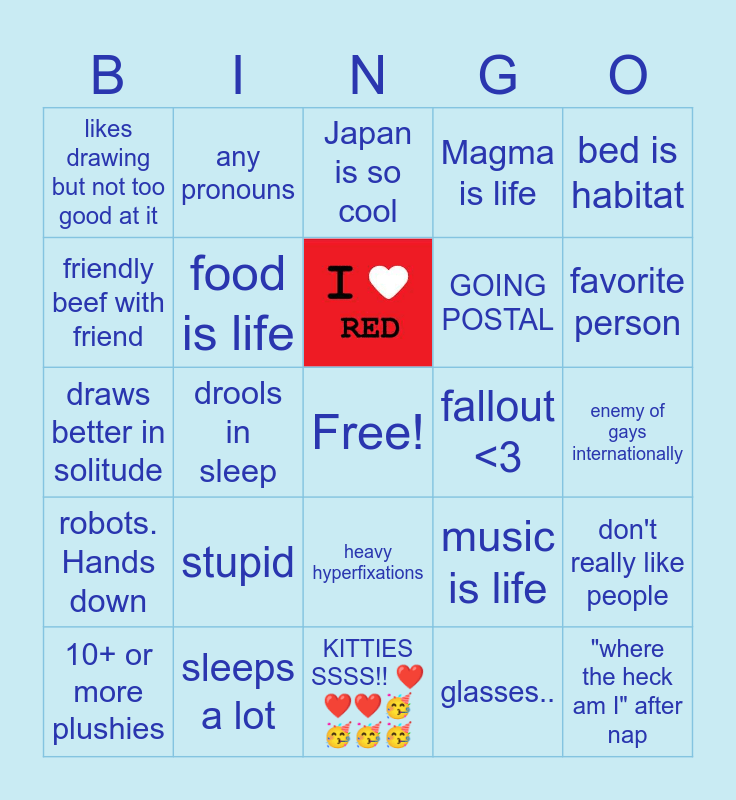 This bingo card has 1 images, a free space and 23 words: stupid, sleeps a lot, 10+ or more plushies, bed is habitat, likes drawing but not too good at it, friendly beef with friend, any pronouns, fallout <3, heavy hyperfixations, GOING POSTAL, draws better in solitude, music is life, don't really like people, food is life, glasses.., enemy of gays internationally, Japan is so cool, favorite person, drools in sleep, "where the heck am I" after nap, robots. Hands down, Magma is life and KITTIES SSSS!! ❤️❤️❤️🥳🥳🥳🥳.