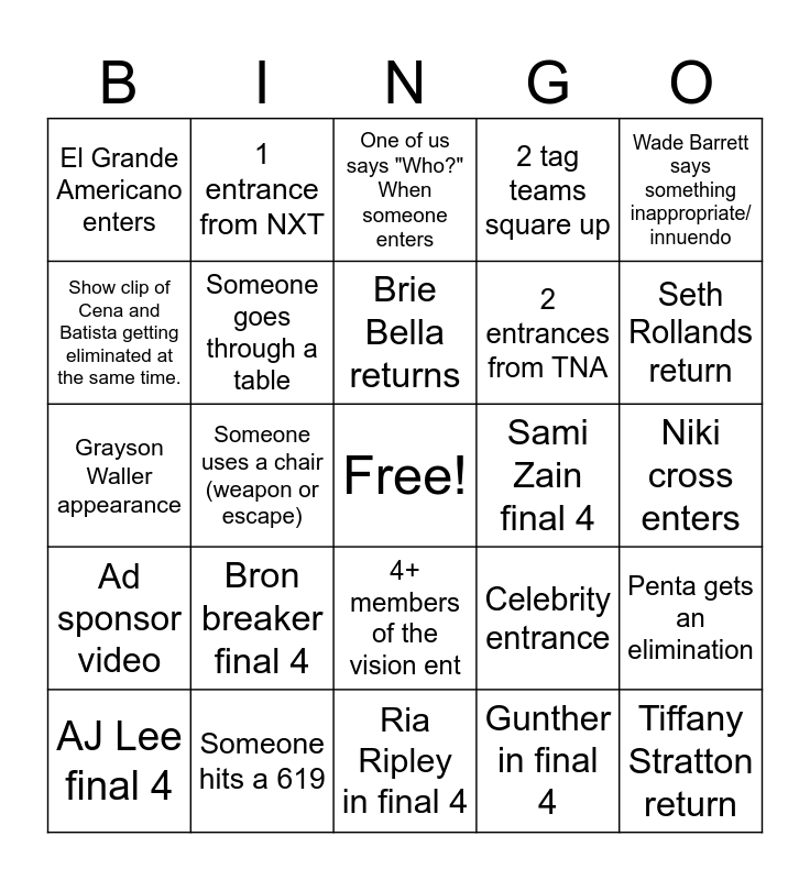 This bingo card has a free space and 24 words: Bron breaker final 4, Someone hits a 619, Brie Bella returns, AJ Lee final 4, Wade Barrett says something inappropriate/ innuendo, El Grande Americano enters, Show clip of Cena and Batista getting eliminated at the same time., 1 entrance from NXT, Sami Zain final 4, 4+ members of the vision ent, 2 entrances from TNA, Grayson Waller appearance, Celebrity entrance, Penta gets an elimination, Someone goes through a table, Gunther in final 4, Niki cross enters, One of us says "Who?" When someone enters, Seth Rollands return, Someone uses a chair (weapon or escape), Tiffany Stratton return, Ad sponsor video, 2 tag teams square up and Ria Ripley in final 4.