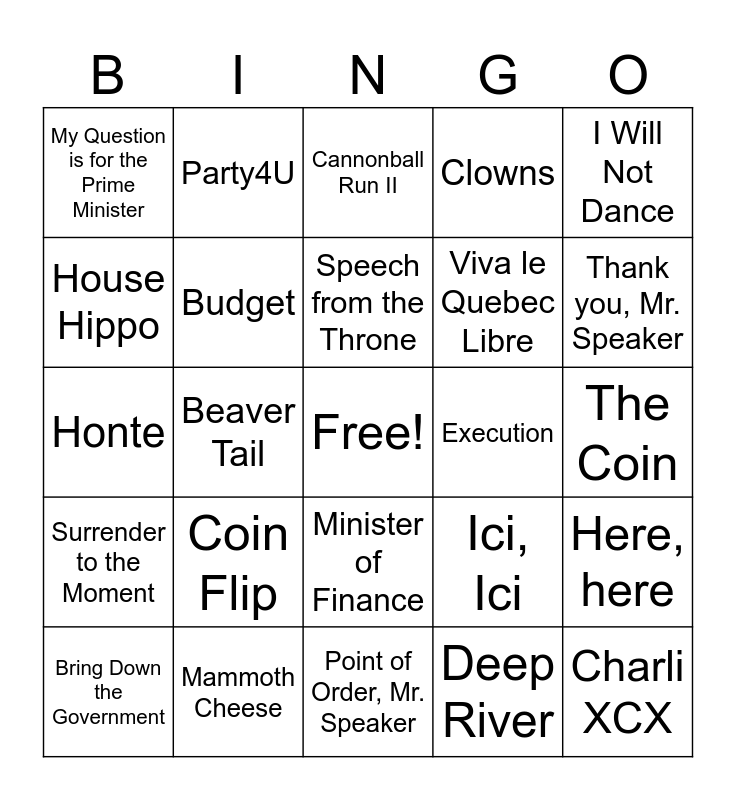 This bingo card has a free space and 28 words: Here, here, Shame, Viva le Quebec Libre, Deep River, House Hippo, Cannonball Run II, Party4U, Surrender to the Moment, Execution, Bring Down the Government, Honte, Clowns, Mammoth Cheese, Point of Order, Mr. Speaker, Thank you, Mr. Speaker, Prime Ministrate, Coin Flip, Budget, Speech from the Throne, Minister of Finance, My Question is for the Prime Minister, That's not the question I asked, Charli XCX, Beaver Tail, The Coin, Ici, Ici, I Will Not Dance and Molten Cheese.