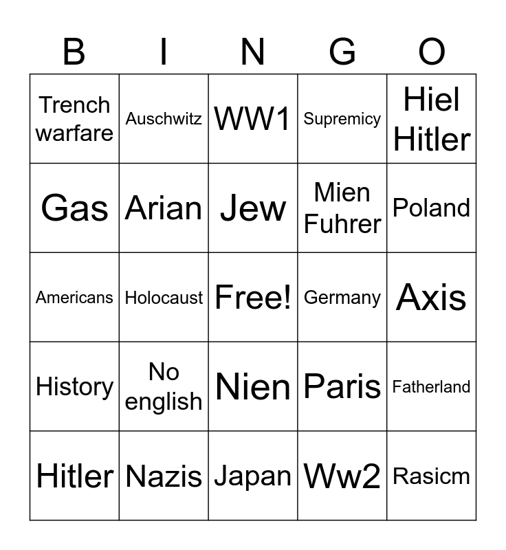 This bingo card has a free space and 24 words: No english, Nazis, Jew, Hitler, Hiel Hitler, Trench warfare, Gas, Auschwitz, Germany, Nien, Mien Fuhrer, Americans, Paris, Fatherland, Arian, Ww2, Axis, WW1, Poland, Holocaust, Rasicm, History, Supremicy and Japan.