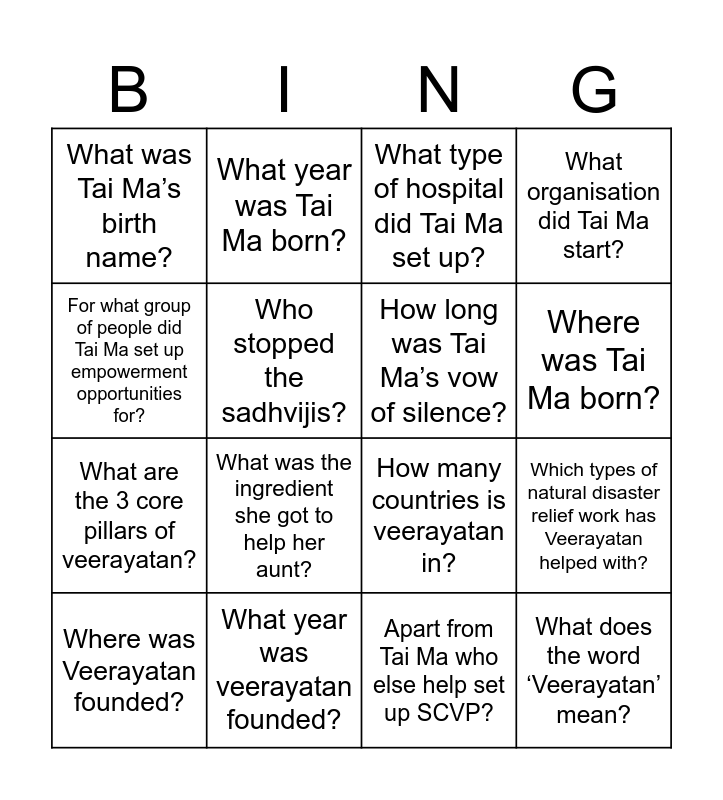 This bingo card has 17 words: Apart from Tai Ma who else help set up SCVP?, Where was Veerayatan founded?, What type of hospital did Tai Ma set up?, What was Tai Ma’s birth name?, What was the ingredient she got to help her aunt?, What organisation did Tai Ma start?, Which types of natural disaster relief work has Veerayatan helped with?, How long was Tai Ma’s vow of silence?, Where was Tai Ma born?, Who stopped the sadhvijis?, What year was veerayatan founded?, How many countries is veerayatan in?, For what group of people did Tai Ma set up empowerment opportunities for?, What year was Tai Ma born?, What are the 3 core pillars of veerayatan?, What did shakuntala buy for her classmates? and What does the word ‘Veerayatan’ mean?.