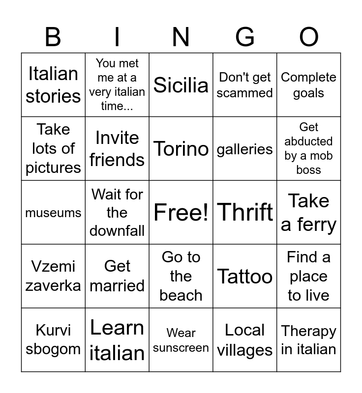 This bingo card has a free space and 24 words: Get married, Learn italian, Torino, Kurvi sbogom, Complete goals, Italian stories, Take lots of pictures, You met me at a very italian time..., Thrift, Go to the beach, galleries, museums, Tattoo, Find a place to live, Invite friends, Local villages, Take a ferry, Sicilia, Get abducted by a mob boss, Wait for the downfall, Therapy in italian, Vzemi zaverka, Don't get scammed and Wear sunscreen.