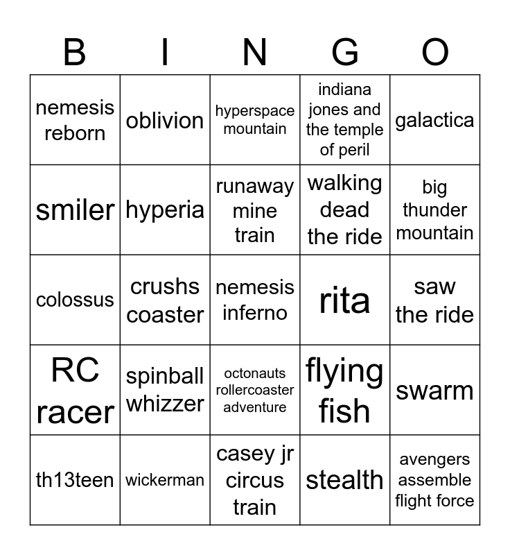 This bingo card has a free space and 24 words: spinball whizzer, wickerman, runaway mine train, th13teen, galactica, nemesis reborn, smiler, oblivion, rita, octonauts rollercoaster adventure, walking dead the ride, colossus, flying fish, swarm, hyperia, stealth, saw the ride, hyperspace mountain, big thunder mountain, crushs coaster, avengers assemble flight force, RC racer, indiana jones and the temple of peril and casey jr circus train.