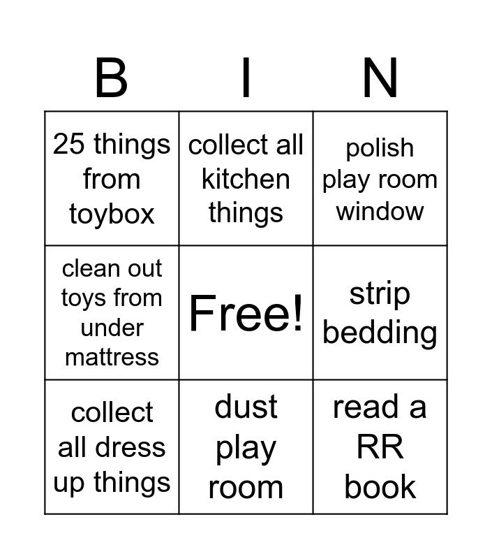 This bingo card has a free space and 8 words: strip bedding, polish play room window, collect all kitchen things, collect all dress up things, 25 things from toybox, read a RR book, clean out toys from under mattress and dust play room.