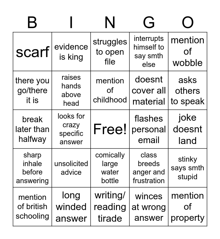 This bingo card has a free space and 24 words: unsolicited advice, long winded answer, mention of childhood, mention of british schooling, mention of wobble, scarf, there you go/there it is, evidence is king, flashes personal email, comically large water bottle, doesnt cover all material, break later than halfway, class breeds anger and frustration, stinky says smth stupid, raises hands above head, winces at wrong answer, joke doesnt land, struggles to open file, asks others to speak, looks for crazy specific answer, mention of property, sharp inhale before answering, interrupts himself to say smth else and writing/ reading tirade.
