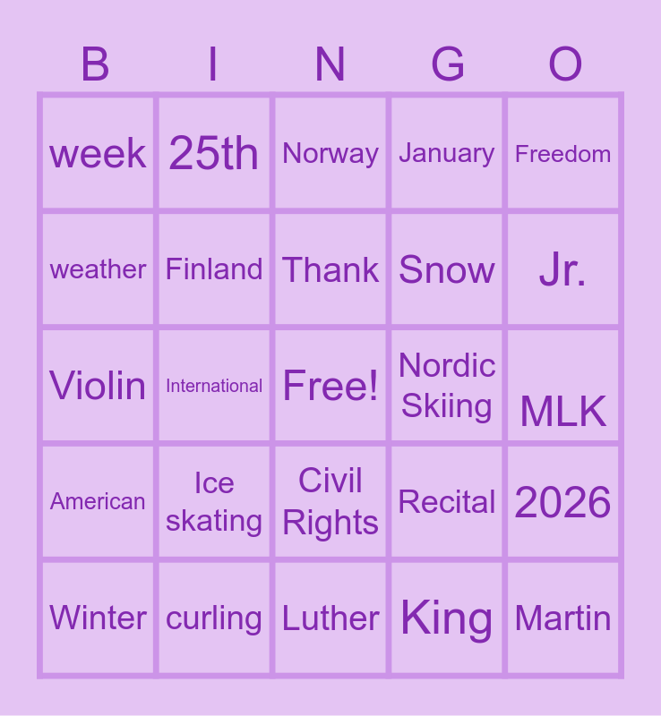 This bingo card has a free space and 29 words: Winter, Olympics, International, sports, week, Norway, Finland, Ice skating, Nordic Skiing, curling, MLK, Martin, Luther, King, Jr., Day, Civil Rights, American, Freedom, Violin, Recital, Snow storm, Snow, weather, January, 25th, 2026, Thank and You.