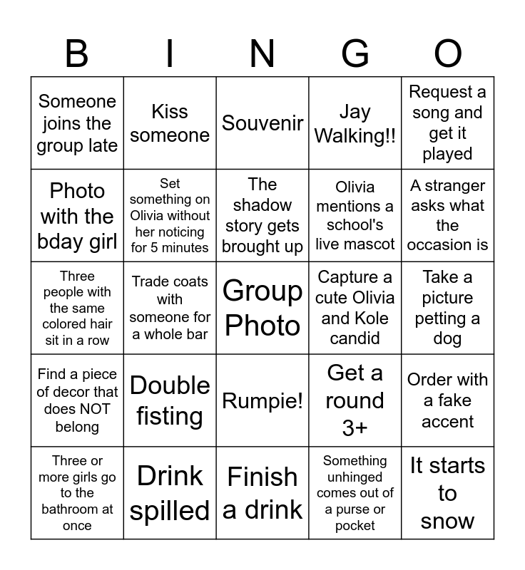 This bingo card has a free space and 39 words: Get featured on Miss Ohio or Gustavo content, Unexpected Law School cameo, Day drinking hard liquor, Set something on Olivia without her noticing for 5 minutes, Three or more girls go to the bathroom at once, Rumpie!, The shadow story gets brought up, Get called "Gorgeous" by Olivia, Request a song and get it played, Find a piece of decor that does NOT belong, Trade coats with someone for a whole bar, Jay Walking!!, It starts to snow, Take a picture petting a dog, Capture a cute Olivia and Kole candid, Double fisting, Olivia inebriated running, Someone joins the group late, Get a stranger to sing happy birthday, Get a round 3+, Photo with the bday girl, Finish a drink, Olivia mentions a school's live mascot, A stranger asks what the occasion is, Dancing, Order a sweet treat, Someone gets Taco Bell, Caffeinated mix drink, Play a drinking game, Kiss someone, Dancing on My Own or Garth Brooks plays, Someone Irish goodbyes, Souvenir, Drink spilled, Something unhinged comes out of a purse or pocket, Get a coin from a stranger, Order with a fake accent, Three people with the same colored hair sit in a row and Shot!!.